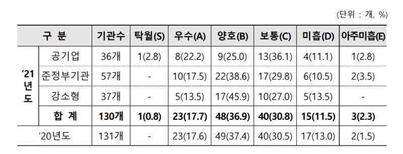 130개 공기업 및 준정부기관에 대한 2021년도 경영실적 평가 결과, 종합등급 탁월(S) 1개, 우수(A) 23개, 양호(B) 48개, 보통(C) 40개, 미흡(D) 15개, 아주미흡(E) 3개로 평가됐다.