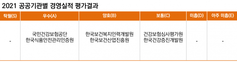 우수(A) 등급을 받은 보건의료 관련 기관은 국민건강보험공단과 한국식품안전관리인증원 두 곳이었다. 건보공단은 2020년도 평가에서 B등급을 받았는데 한 단계 상승했다.