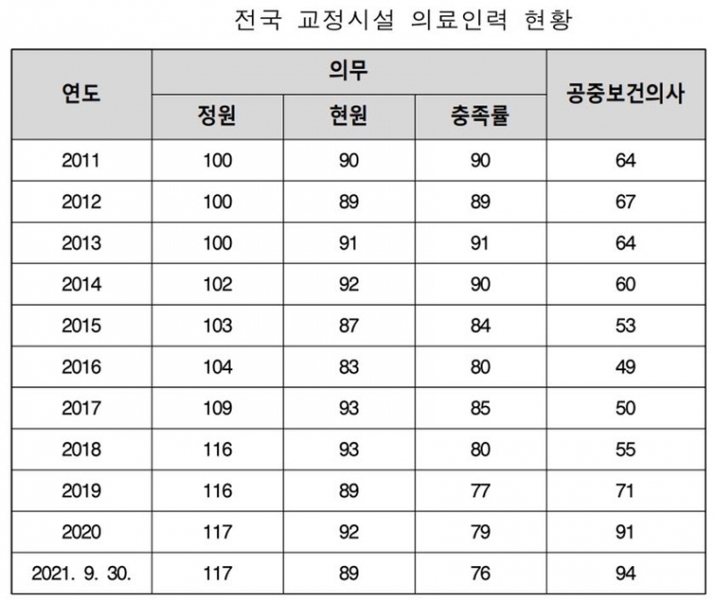 2021년 9월 기준 전체 교정시설 일평균 진료환자는 4804명으로, 89명의 의사가 나눠 진료하고 있는 것으로 나타났다.