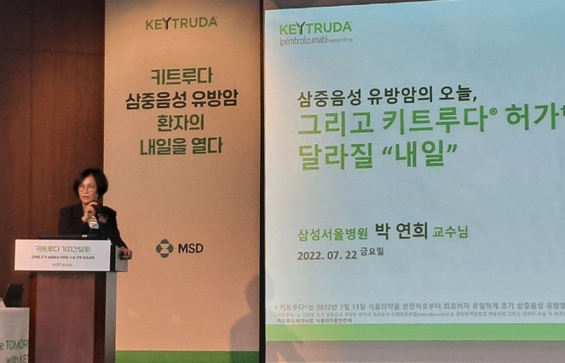 MSD는 이번 허가를 기념해 22일 서울 은행회관에서 기자간담회를 열었다. 키트루다 3상 연구에 참여한 박연희 삼성서울병원 임상시험센터장(종양내과 교수)은 이날 발표자로 나서 키트루다 허가 의미를 짚어봤다.