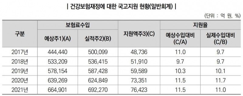 현행 법상 정부는 매년 건강보험료 예상수입액의 14%에 상당하는 금액을 국고에서 지원토록 규정하고 있지만 실제는 그 훨씬 적은 지원이 이뤄지고 있는 실정이다.