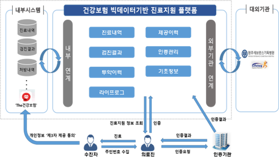 건보공단은 진료내역과 처방내역 등을 연계하고, 외부기관 역시 해당 플랫폼을 통해 인증관리 및 제공이력 등을 연계한다.