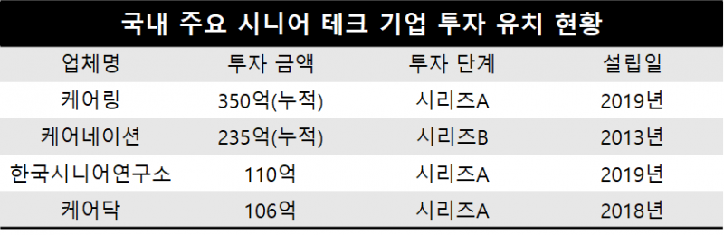 시니어 테크 기업 케어링도 최근 300억원 규모 투자유치에 성공하며 서비스 고도화에 속도를 높이고 있다. 케어링은 지난해에도 50억원 규모 프리시리즈A 투자를 유치한 바 있다.