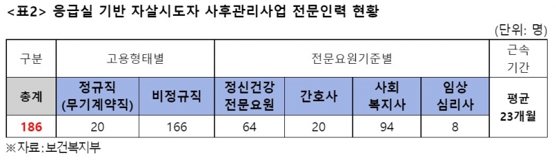 현재 전국 사후관리 전문인력은 총 186명으로 이 중 89.2%(166명)가 비정규직이다. 평균 근속기간 역시 2년도 채 안되고 23개월에 불과해서 지속적이고 안정적인 서비스를 제공하기엔 한계가 있다.