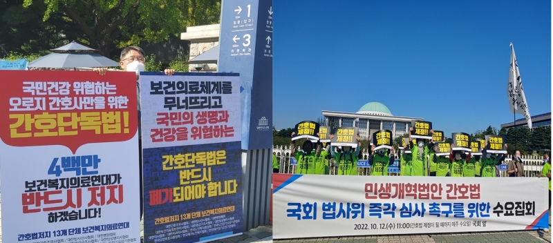 국회 국정감사가 중반을 넘어서면서 간호법 제정을 둔 보건복지의료연대와 간호협회 간 장외 투쟁도 치열하다. 13개 직역의 릴레이 시위에 맞서 간호계는 수요집회를 통해 목소리를 내고 있다.