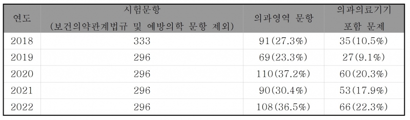 2018년 한의사 전체 시험문항 333개 중 의과영역 문항은 91개(27.3%)였지만, 2022년 총 296개 문항 중 108개(36.5%)로 증가했다.