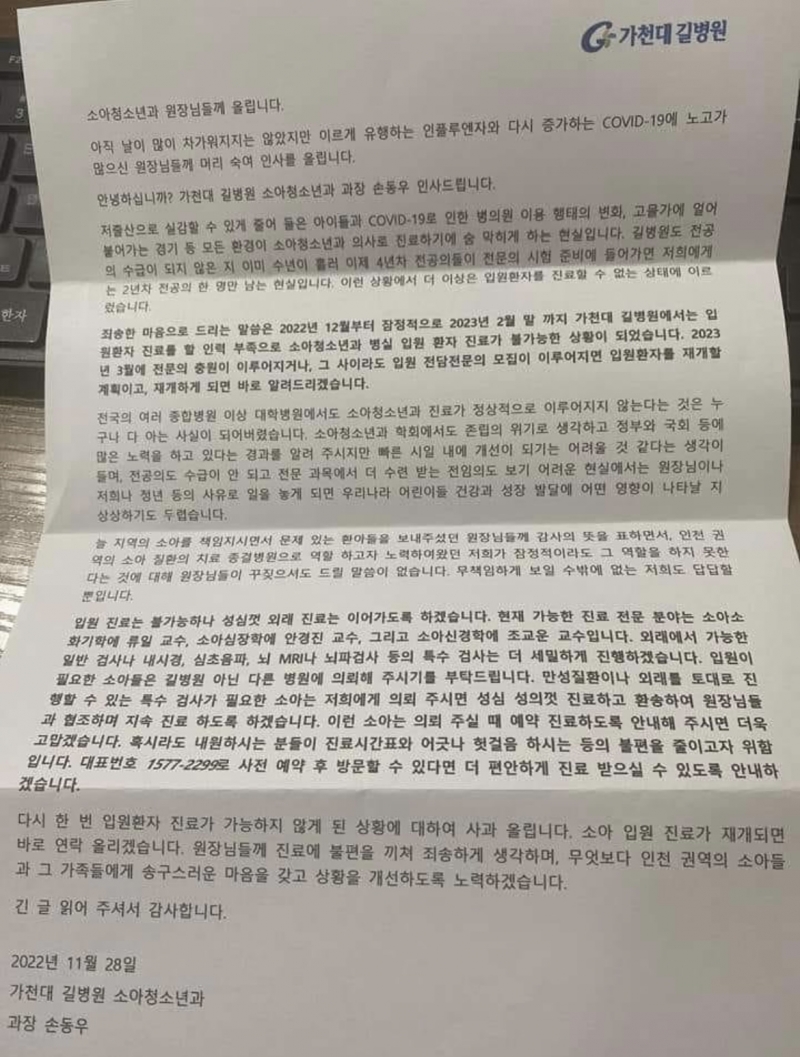 가천대 길병원 소아청소년과 손동우 과장은 최근 “길병원은 잠정적으로 2022년 12월부터 2023년 2월 말까지 입원을 중단한다”는 내용이 담긴 공지를 발표했다.