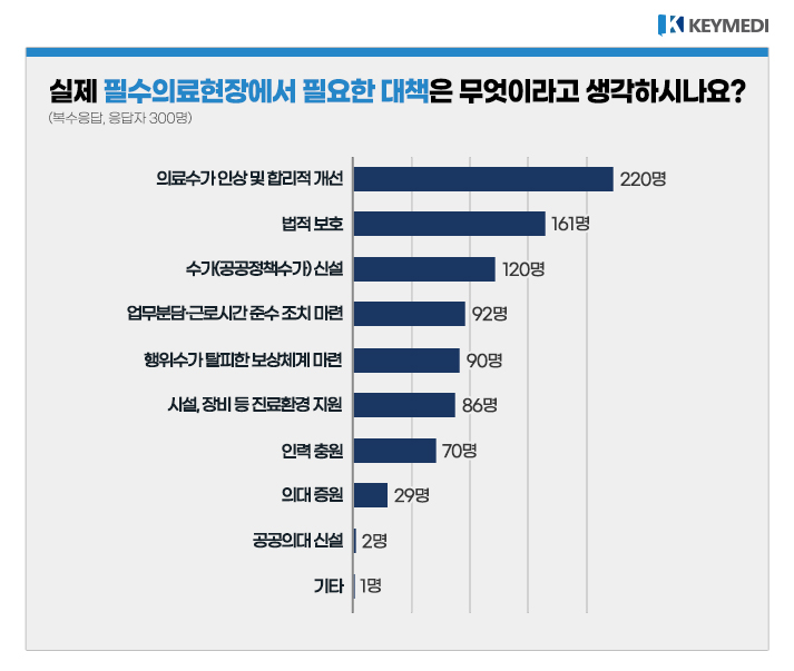'실제 필수의료현장에 필요한 대책'을 묻는 질문에는 응답자(복수 선택)의 약 3분의 2가 넘는 220명이 '의료수가 인상 및 합리적 개선'을 지목했다.