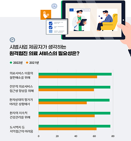 조사 결과를 보면, 사업에 참여한 의료인 77%는 "의료취약지 원격협진 서비스가 필요하다"고 응답했다. 원격협진은 의료서비스 이용 불편을 해소하기 위해 가장 필요하다고 생각(79.5%)하는 것으로 나타났다.