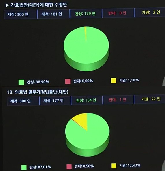 간호법은 재적 300명 중 국민의힘 의원들이 퇴장한 결과 181명이 재석했으며 ▲찬성 179표 ▲반대 0표 ▲기권 2표 등으로 가결됐다.