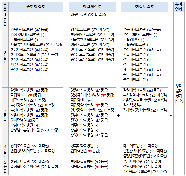 22개 공공의료기관 중 종합청렴도 1등급은 존재하지 않았다. 2등급은 ▲경북대병원 (2등급↑, 전년대비 등급 변화) ▲경상국립대병원(-) ▲국립중앙의료원(-) ▲서울특별시서울의료원(미측정) ▲전남대병원 (1등급↑) ▲전라북도군산의료원 (미측정) ▲전북대병원(1등급↑) ▲제주대병원(2등급↑) ▲충북대병원(1등급↑)이다.