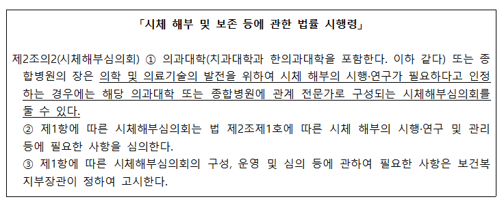 이어 "현재 시행령에 명시된 시체해부심의회가 시체 해부 참관 목적 및 필요성을 심의해 허가한다면 개정안 취지를 살릴 수 있고 현행법 방향성에도 부합한다"고 제언했다.