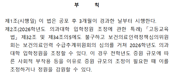 부칙으로는 "보건의료인력정책심의위원회에서 2026학년도 의대 정원을 새롭게 정한다"는 내용을 담았지만, 감원을 명시한 건 아니다.