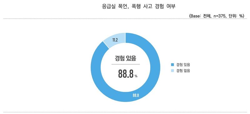 조사결과 무려 응답자의 88.8%가 ‘응급실 폭언, 폭행 사고를 경험한 적이 있다’고 답했다. 응급의료 종사자 10명 중 9명은 위협적인 상황을 겪었다는 얘기다.