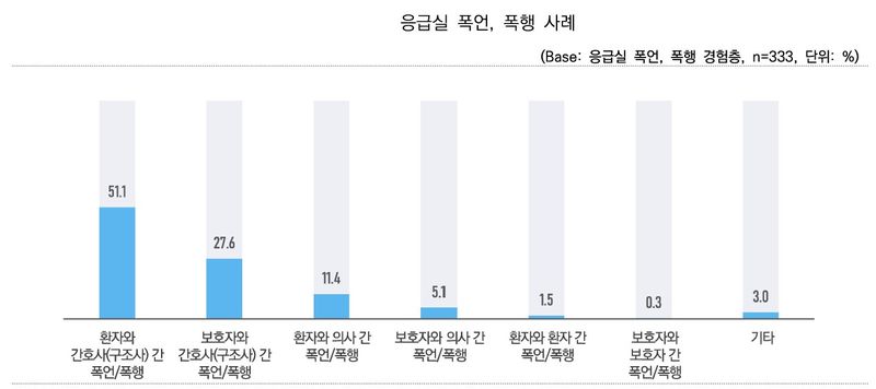 실제 응급실 폭언, 폭행 사례는 ‘환자와 간호사’ 사이에서 발생한 경우가 절반 이상인 51.1%를 차지했다. ‘환자와 의사’ 간 폭언‧폭행도 11.4%나 됐다.