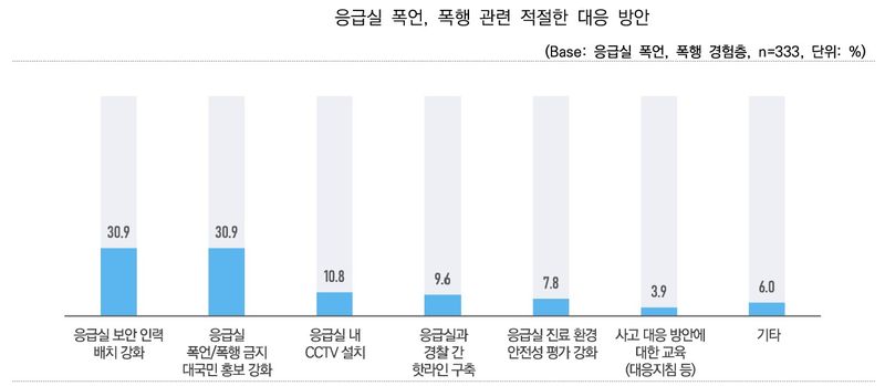 이 외에도 ‘응급실 CCTV 설치’(10.8%), ‘경찰 간 핫라인 구축’(9.6%), ‘응급실 진료환경 안정성 평가 강화’(7.8%) 등을 필요한 방안으로 제안했다.