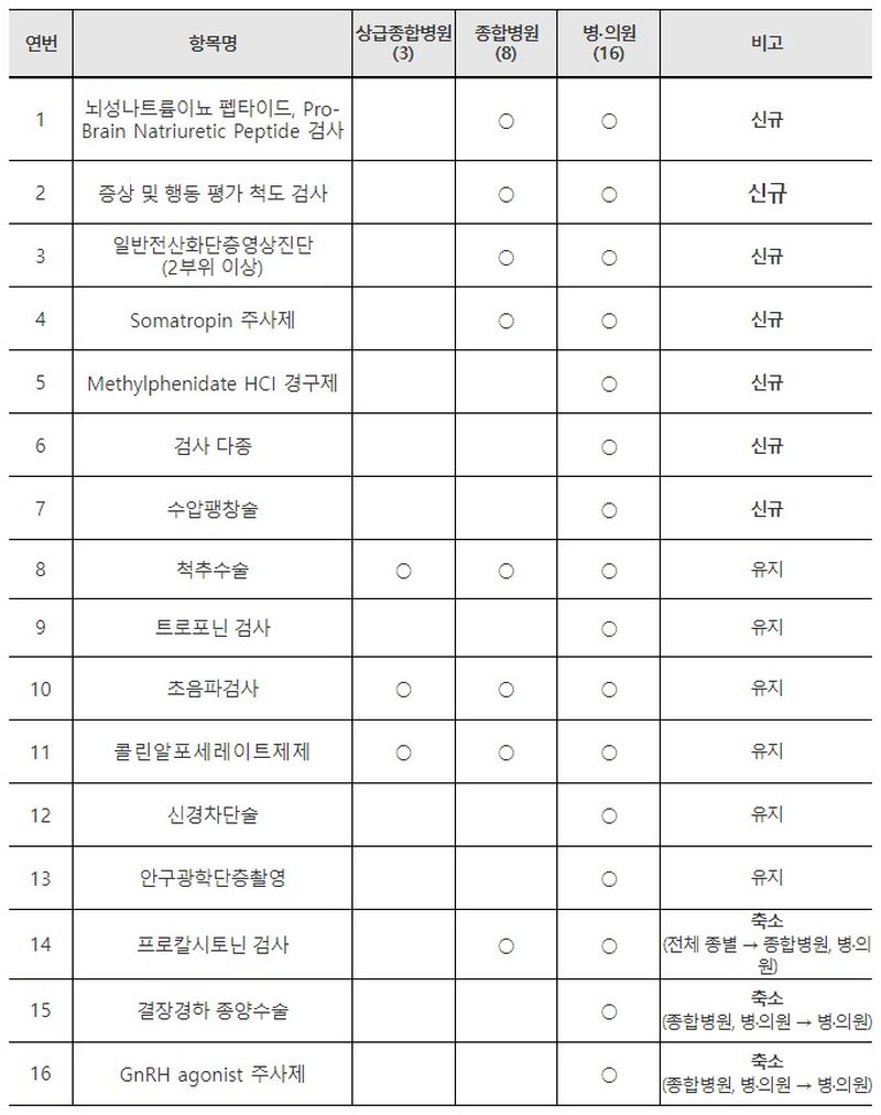 2025년 신규 항목은 총 7항목으로 ▲뇌성나트륨이뇨 펩타이드 검사 ▲증상 및 행동 평가 척도 검사 ▲일반전산화단층영상진단 ▲Somatropin 주사제 ▲Methylphenidate HCl 경구제 ▲검사 다종 ▲수압팽창술 등이다.