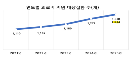 우선 2025년 ‘희귀질환자 의료비 지원사업’ 대상질환이 기존 1272개에서 66개가 추가돼 1338개로 확대된다. 중증난치질환 24개도 포함된다.