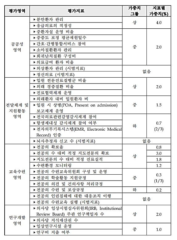 성과 중심으로 개편된 평가지표 가운데 주목받는 항목은 환자경험과 진료성과다. 환자가 경험한 진료 만족도와 실제 의료결과가 점수에 직접 반영되는 구조로, 폐렴, 뇌졸중, 만성질환, 마취 등의 진료성과 항목들이 적극 반영될 예정이다.