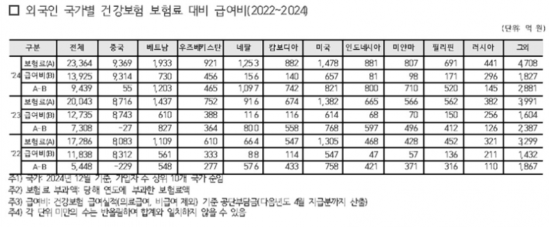 그동안 중국인 건강보험 재정 수지는 2022년 229억, 2023년 27억 원 적자를 기록한 바 있다.