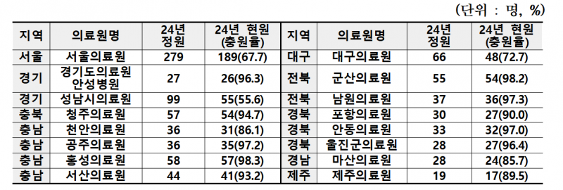 의사인력 충원도 심각한 문제로 드러났다. 전국 35개 지방의료원 중 16곳이 의사 정원을 채우지 못했다.