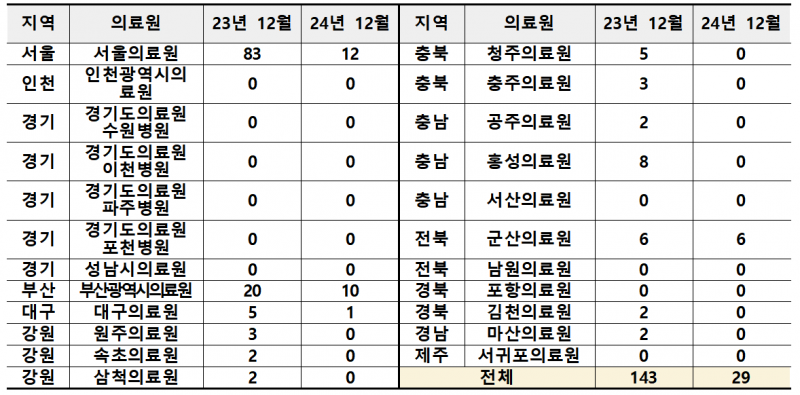 서울의료원은 83명에서 12명으로, 부산의료원은 20명에서 10명으로 감소했다. 전공의가 없는 의료원은 8곳에서 19곳으로 두 배 이상 확대됐다.