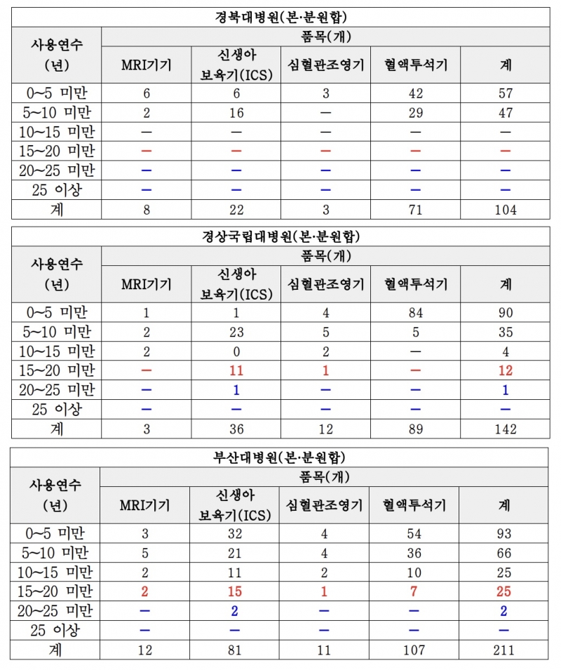 MRI(자기공명영상) 기기, 혈액투석기, 신생아보육기(ICS), 심혈관조영기 등이 포함됐으며, 병원별로는 부산대병원과 충남대병원이 각각 27대, 충북대병원과 전남대병원 각 21대, 경상국립대병원 13대였다.