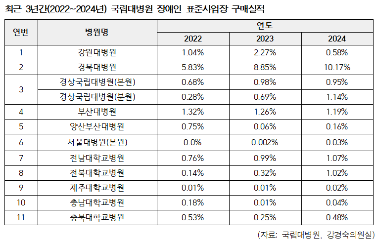 강경숙 의원 "국립대병원 11곳 중 6곳, 장애인 표준사업장 의무구매율 위반"