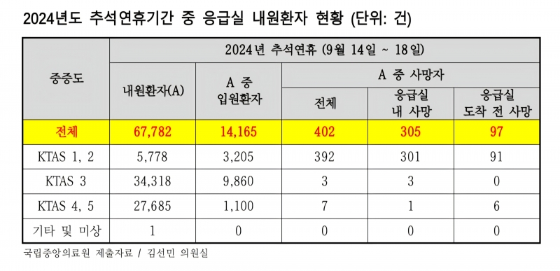 김 의원이 국립중앙의료원으로부터 제출받은 자료에 따르면, 작년 추석연휴 동안 응급실을 찾은 환자는 총 6만7782명으로 사망자는 402명이나 됐다.