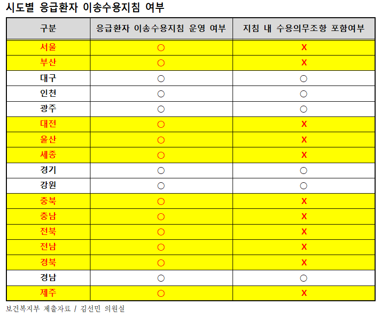 국회 보건복지위원회 김선민 의원(조국혁신당)은 보건복지부로부터 제출받은 이달 12일 기준 광역자치단체 응급실 이송·수용 지침 자료를 공개했다.