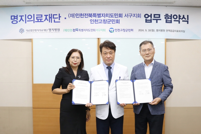명지병원(병원장 김진구)은 최근 인천전북특별자치도민회 서구지회(회장 윤다연) 및 인천고창군민회(회장 김종태)와 협약을 체결했다다.