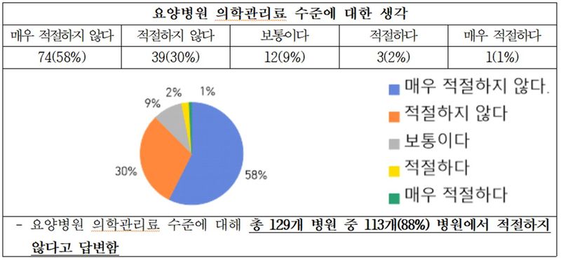 설문조사 결과 요양병원 의학관리료 수준에 대해 113개(88%) 병원이 “적절하지 않다”고 답했고, “적절하다”는 답변은 3곳(3%)에 불과했다.