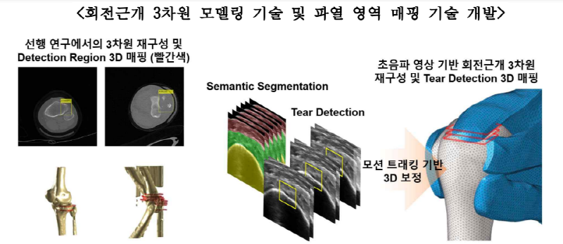 이에 전 교수는 딥러닝 객체검출 알고리즘 기술인 'YOLO 모델'과 딥러닝 기반 의미적 분할(Semantic Segmentation) 기술을 활용해 초음파 영상으로부터 회전근개 파열 부분을 구분하고 3차원 영역으로 재구성했다.