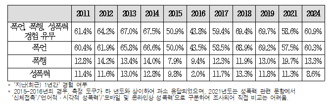 피해 유형으로는 폭언 경험이 60.3%로 가장 높았고 폭행 13.3%, 성폭력 8.6% 등이 뒤를 이었다.