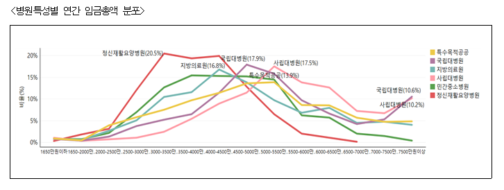 병원 종별로 임금구간 분포를 비교하면 사립대병원, 특수목적공공병원은 5000~5500만원 구간 비중이 컸다.