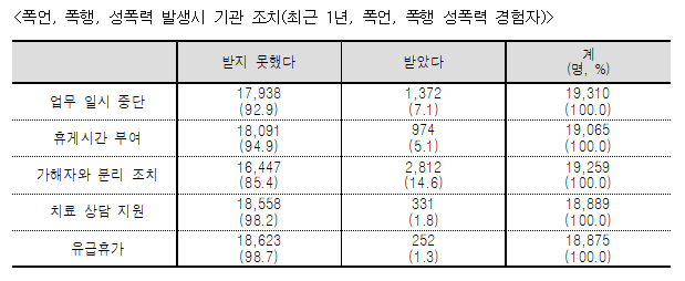 최근 1년 내 폭언, 폭행, 성폭력 경험자를 대상으로 피해 발생시 피해자 보호를 위한 조치들이 이뤄졌는지 조사한 결과, 대부분 별도 조치를 제공받지 못했다고 응답했다. 이 조치는 업무 일시 중단, 휴게시간 부여, 가해자와 분리 조치, 치료 상담 지원, 유급휴가 등을 말한다.