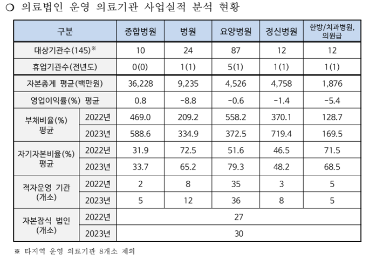 의료법인 사업실적 분석결과를 보면 종합병원만 평균적으로 영업이익을 냈고, 그 외 의료기관은 전반적으로 영업손실을 봤다. 자본잠식 상태에 빠진 법인은 30곳이고, 적자운영 병원은 66곳이다.