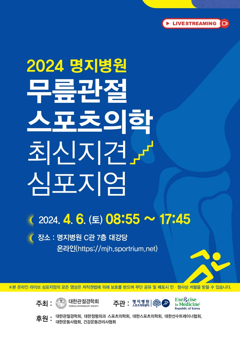무릎 명의(名醫) 김진구 병원장을 비롯해 의사 및 운동전문가 30여 명이 참여하는 이번 행사는 4월 6일 오전 8시 55분부터 명지병원 C관 7층 대강당에서 열린다. 신청자에 한해 심포지엄 홈페이지에서 영상으로도 시청할 수 있다.