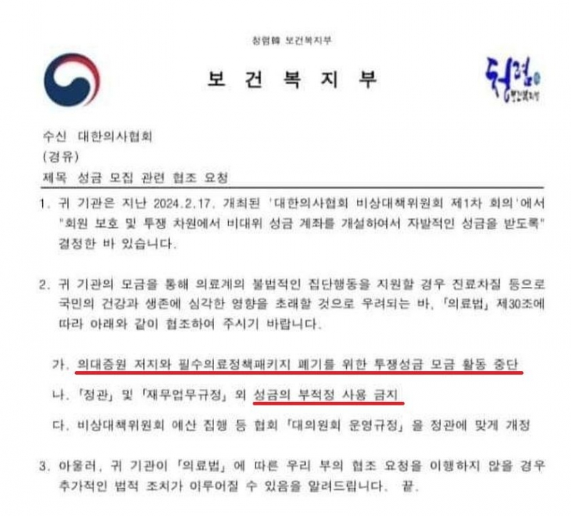 복지부는 "의협이 모금을 통해 집단행동을 지원할 경우 국민의 건강과 생존에 심각한 영향을 초래할 것으로 우려된다"면서 "의료법에 따라 투쟁 성금 모금 중단 및 성금의 부적정 사용 금지 등 비대위 예산 집행 관련 규정을 정관에 맞게 개정하라"고 주문했다.