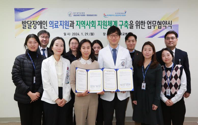 제주대학교병원 발달장애인거점병원·행동발달증진센터(센터장 문덕수)가 한국장애인개발원 제주특별자치도 발달장애인지원센터(센터장 이은선)와 업무협약을 체결했다.