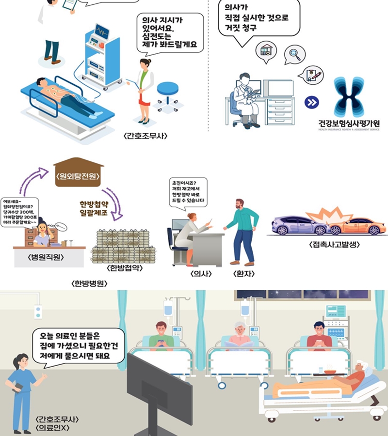 이들 병원에서 확인된 위법 행위는 ▲보험금 편취 ▲진료기록부 거짓작성 및 자보진료수가 청구 ▲진료기록부 거짓 작성 ▲당직의료인 부재 등이다.