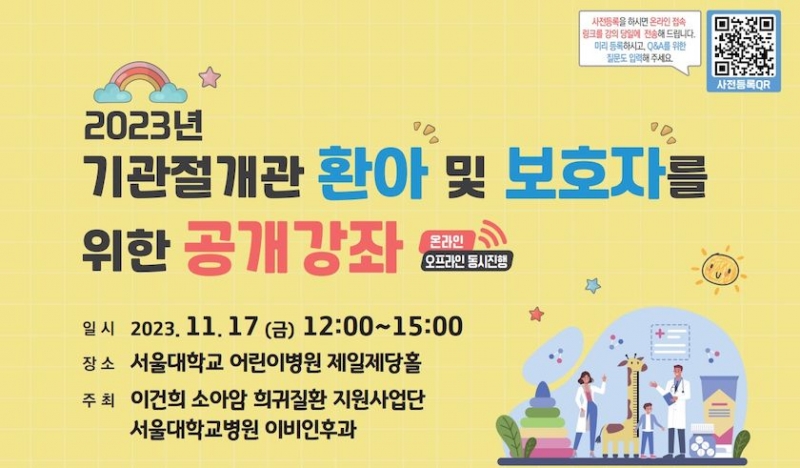 2부는 서울대병원 이비인후과 권성근 교수가 좌장을 맡아 기관절개술 사전 등록을 통해 접수된 환아와 보호자들이 궁금해하는 내용에 대한 Q&A 시간이 진행될 예정이다.