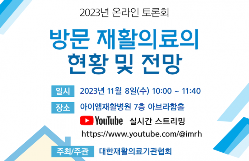 대한재활의료기관협회(이상운 회장)는 오는 11월 8일 오전 10시 아이엠재활병원 아브라함홀에서 ‘방문재활 현황 및 전망’을 주제로 토론회를 개최한다.