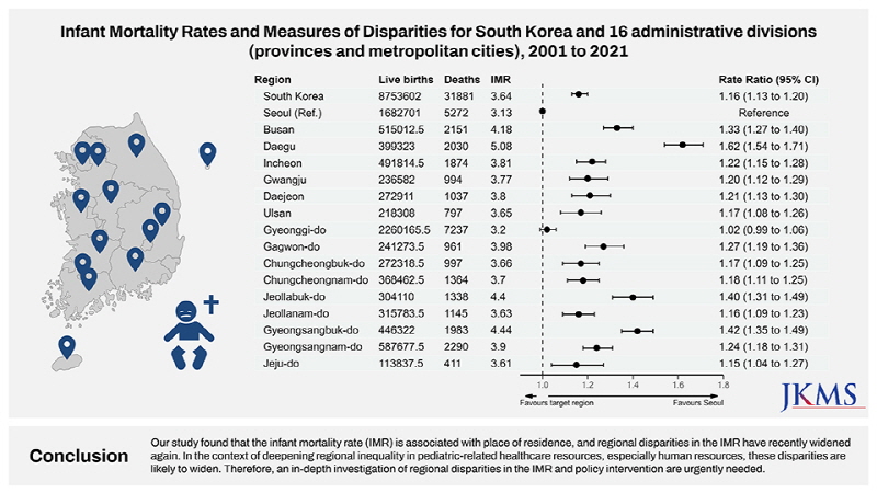 연구팀은 “우리나라 전체 영아 사망률은 점차 낮아지고 있지만 지역간 차이에 대해서는 알려진 바가 없었다”며 “최근 소아과 전공의의 급격한 감소로 인해 지역의 소아과 전문의가 부족해지면서 소아과가 위기를 겪고 있다”고 전했다.