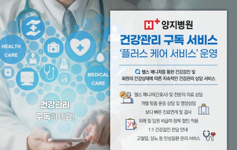 에이치플러스 양지병원 건강증진센터는 최적의 맞춤형 건강관리 서비스를 1년 동안 받을 수 있는 ‘건강관리 구독 서비스(Plus Care Service)’를 전개한다.