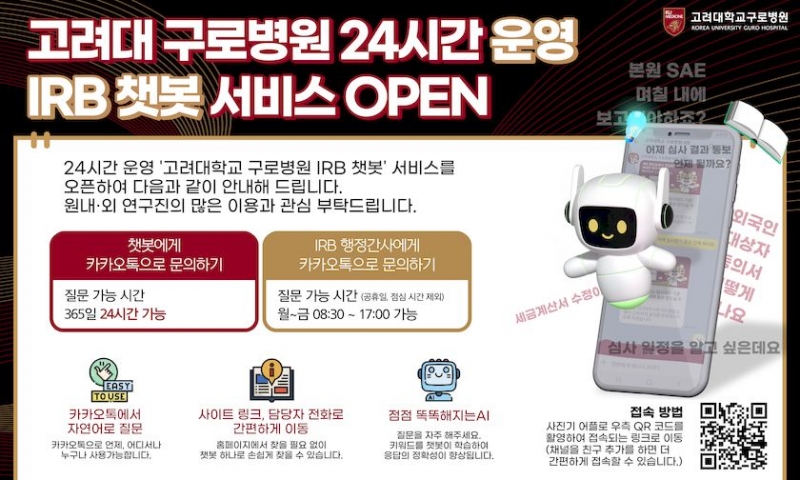 고려대학교 구로병원(병원장 정희진)이 임상연구자들을 위한 ‘임상연구문의 인공지능 챗봇’을 개발했다.