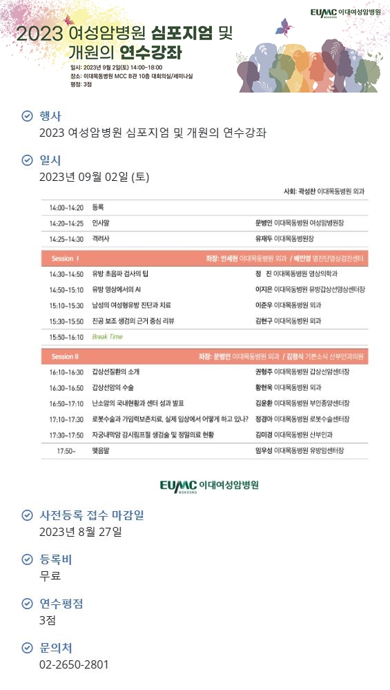이대여성암병원(병원장 문병인)은 오는 9월 2일 14시부터 18시까지 이대목동병원 MCC B관(별관) 10층 대회의실과 세미나실에서 '2023 여성암병원 심포지엄 및 ' .