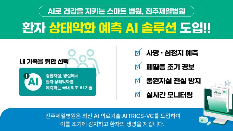 진주제일병원(병원장 정의철)은 최근 입원환자의 응급상황에 빠르게 대응하기 위해 의료 인공지능(AI) 솔루션인 ‘AITRICS-VC(바이탈케어)’를 전격 도입했다.