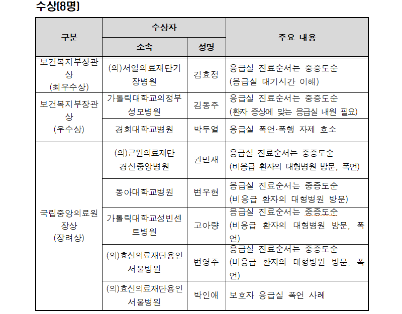 우수상은 ‘소중한 한 분을 살리기 위해서 모두가 하나가 되는 곳(가톨릭대학교의정부성모병원 김동주)’과 응급실 진료 현장에서 발생하는 폭언 및 폭행 자제를 위한 내용을 담은 ‘나는 당신의 아픔을 안다(경희대학교병원 박두열)’가 선정됐다.