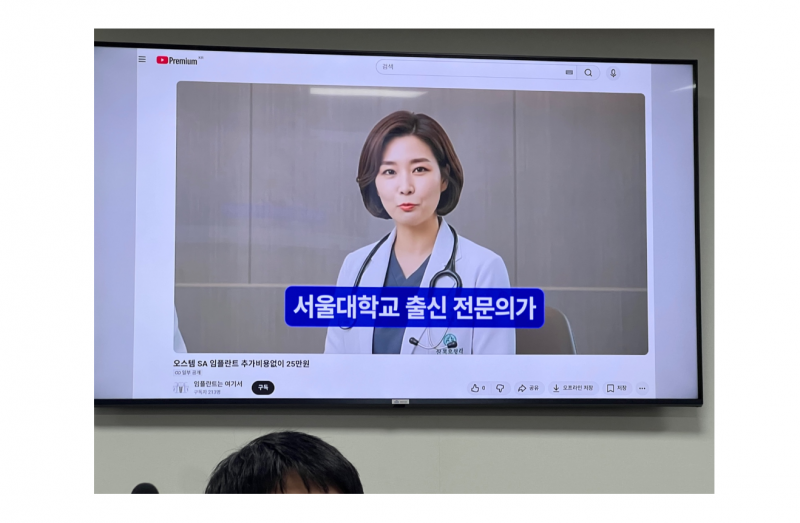 그는 “최근 유튜브에 올라오는 임플란트 광고 상당수가 AI로 합성한 가짜인물”이라며 “서울대 출신 전문의가 시술한다는 문구를 내걸지만 실제 면허자 정보는 확인하기 어렵고 병원명조차 불명확한 경우가 많다”고 지적했다.